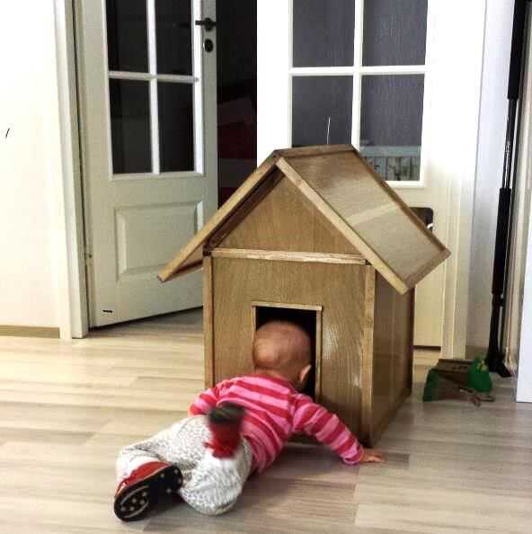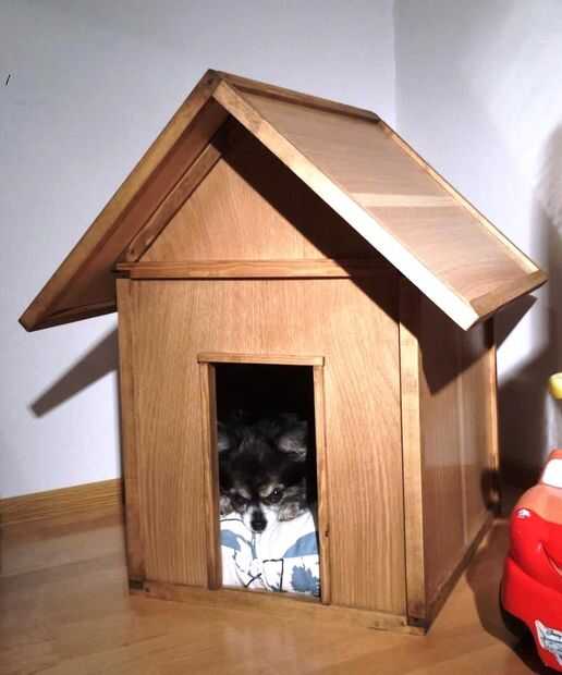 Mi hija mantiene acosando a nuestro perro y como no tengo nada que hacer en aquel momento decidí construir un refugio interior para ese pobre perro. La idea era crear algo que podría ser rápidamente desmontada y reconstruida si el espacio era necesario para otra cosa. También no quería utilizar alguna solución de fijación adhesivos o tornillos. La estructura está y permanece intacta debido a la fricción causada por la hinchazón de las clavijas de madera.