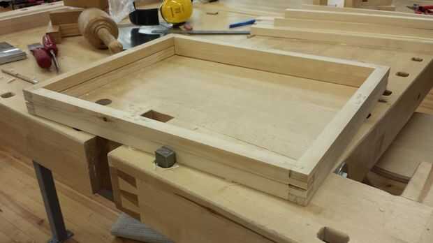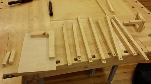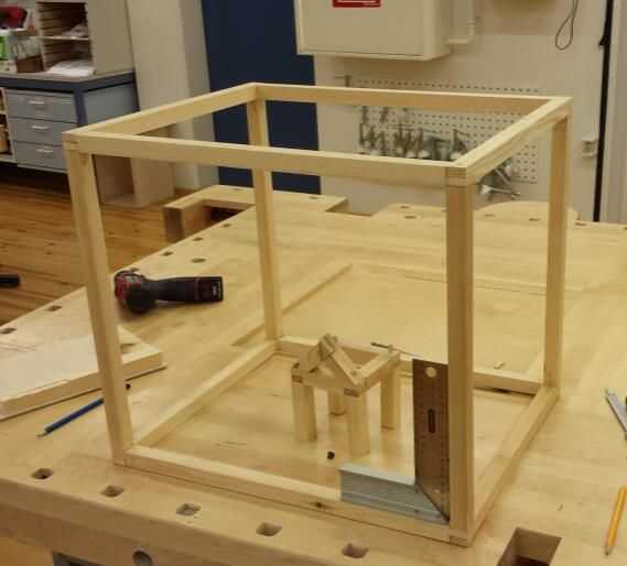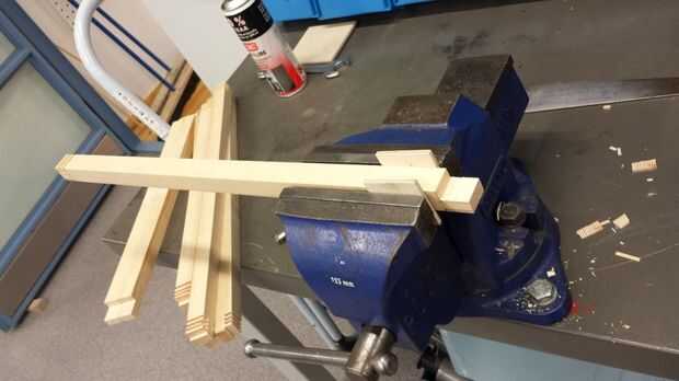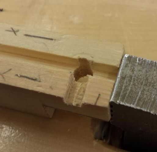 Para el comienzo hice unos 30 2x2x50cm cepillada barras de pino. El marco de la casa se hace de aquellos. Luego que asierra una ranura (o un canal, lo siento mi ingles) de 6 mm en los 2 lados de casi todos los bares. La ranura está allí para sostener 4 mm placas de madera contrachapada (+ 2 mm de la chapa) en el lugar. Hice una plantilla para la perforación precisa de los agujeros y perforar los orificios de esquina para los tapones de rowan. Entonces mano hizo los detalles del conjuntos en los extremos de las barras con un cincel.