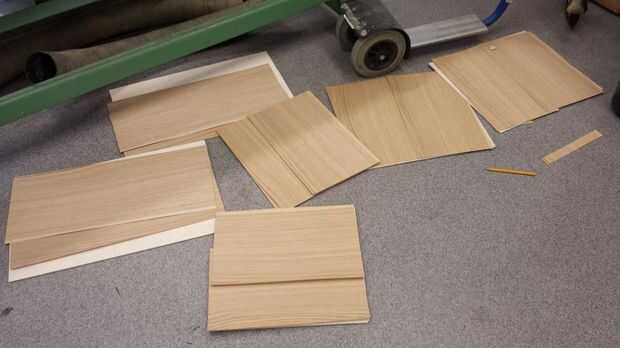 Opté por usar chapa roble blanco sólo porque me ha pasado que tienen una pequeña cantidad de la misma a mano en ese momento. He intentado ser lo más eficiente posible corte de la chapa y porque no tenía ningún exceso chapa realmente pude no corte la parte blanca. Por eso decidí ponerlo directamente en el centro de cada tablero y realmente no se ve mal en mi opinión :)