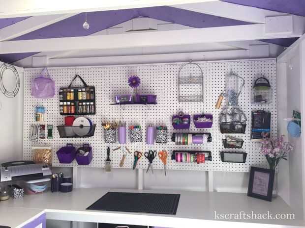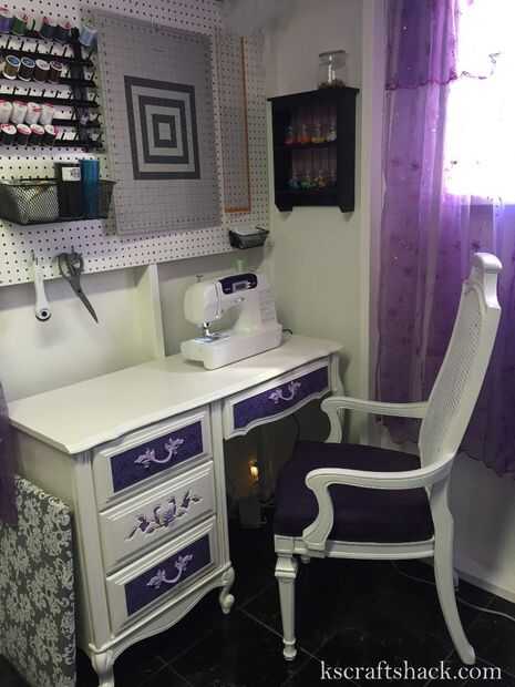 Para darme más opciones de almacenamiento, colgamos pegboard en dos de las paredes. Uno sobre un contador a través de una pared entera y el otro por encima de mi mesa de costura. Ambos tableros me dan un montón de opciones de almacenamiento y encajan en el presupuesto en menos de $20 por 4 pies por 8 pies de tabla.