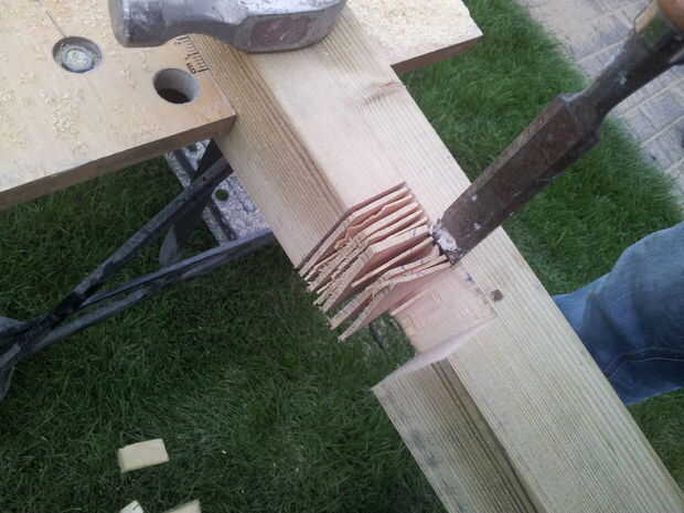 Para hacer el anillo de vigas ontop de los pilares que he intentado bloquear los haces cortando muescas en forma de U en las vigas, por lo que encajan perfectamente entre si. Localizar un punto exacto te con un lápiz y luego hice una docena de pequeños cortes en la profundidad adecuada con mi círculo vio. Estas losas poco donde es bastante fácil de chisle hacia fuera. Probablemente es un nombre de fantasia o algún otro método de beter, pero esto funcionó para mí.