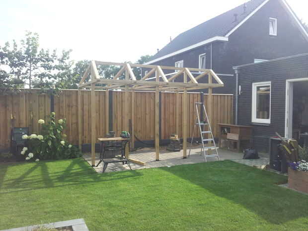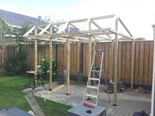 Para hacer las cerchas (las formas del triángulo) que sólo libre la primera de ellas y luego copian esto 5 veces. Esto implicó un poco de corte diagonal y no ir a la derecha de la primera vez. Pero finalmente salió bastante agradable. Sólo tienes que tomar tu tiempo. También hice una maqueta en el suelo de mi garaje y puesto que el suelo está perfectamente nivelado Esto funcionó bastante bien.
