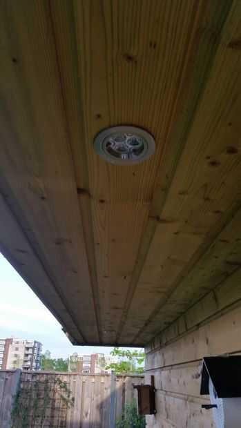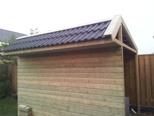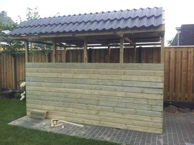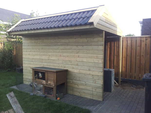 Para las paredes yo también pedí madera tratada a presión. Estos se realizan los tablones que bloquear para que no se puede obtener agua en el interior. No sé la palabra en inglés para él. Para el ajuste usé la misma madera. Para obtener la parte superior impermeable instalé un perfil L de PVC que tiene cualquier ferretería. Para el alero también utilizar los tablones de la misma y mientras estaba bussy puse en 2 focos de LEDs. Ahora el Sr. Binky el conejo no sólo es seco pero también puede ver lo que come en la noche!