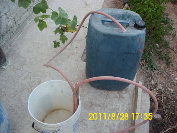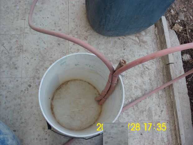 2 - cuerda la manguera que viene del digestor y el otro trozo de manguera (uno largo) a un palito con hilos o cuerdas (ver fotos). No lo hacen tan apretado, así que el biogás puede ir a través de mangueras.