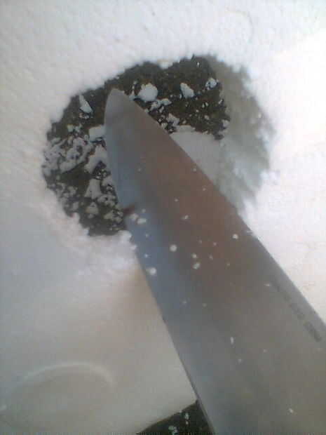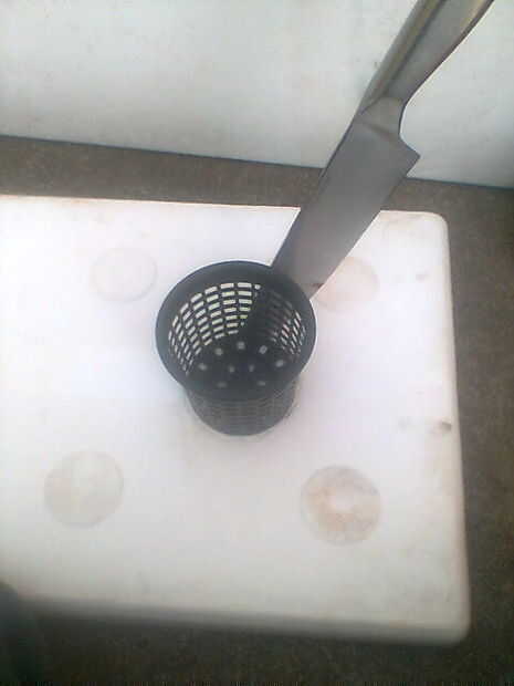 Esto hará un agujero demasiado pequeño, sino que queremos empezar o el riesgo de romper la tapa. Una vez que haya un agujero pequeño correr el cuchillo alrededor del interior del agujero hasta que la olla se ajusta firmemente.