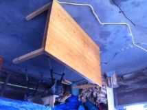 Quita las piernas y los corredores de la tabla de café y había guardado todo el hardware. Cortan la Sierra de mesa para que sea un cuadrado con un skil. Lijar hasta la madera cruda en ambos lados y en forma el lado corto para que coincida con los otros bordes con una lijadora eléctrica.
