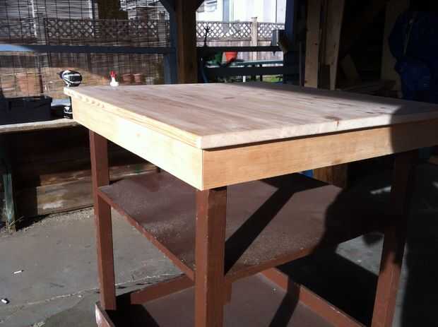 Había establecido la pieza cuadrada superior en el lado tierra, acabado hacia abajo y al revés el carro sobre él. Que centrado en el carro de la herramienta sobre la pieza de la tapa de tabla y dibujó el contorno con lápiz. Yo con la punta de la cesta de abajo y poner un montón de pegamento dentro de las marcas del lápiz. Punta el carro hacia arriba y me atornilló la cesta a la mesa de arriba abajo de debajo. Me levantó la cesta y dejarla secar durante 24 horas. Le di el pino un buen lijado con lija fina y un bloque de lijado.
