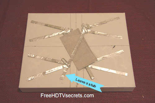 freehdtvsecrets.com), pero no visto a estar en servicio más) y sólo lo duplicado enganchando los extremos (stubs) juntos y los talones de centro de conexión hacia el convertidor de televisión de alta definición mediante un transformador. Usé cinta de celofán en lugar de clips de papel y cartón para separar las secciones por lo que parece más fluida.