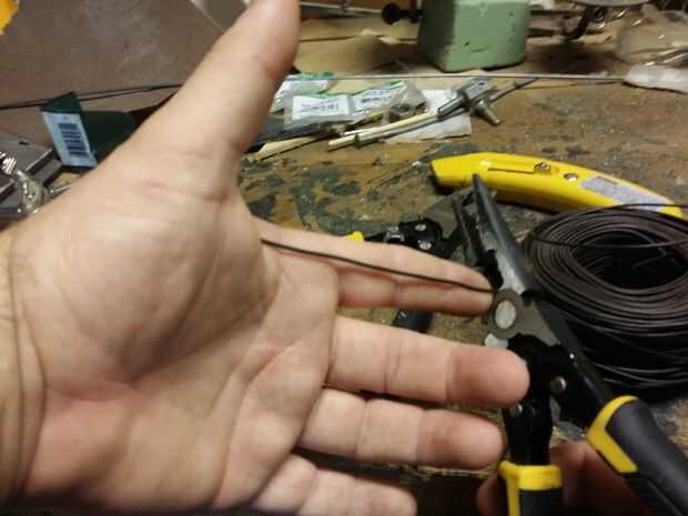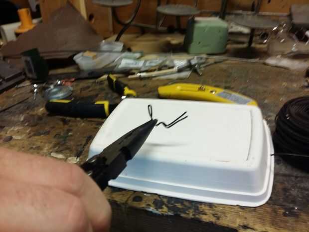OK, después de cortar el alambre, doblar por la mitad. Idealmente usted quiere tipo de apriete juntos a lo largo de la longitud para salir donde está lo suficientemente delgada para caber en los agujeros del paquete estándar (sobre un 1/4").