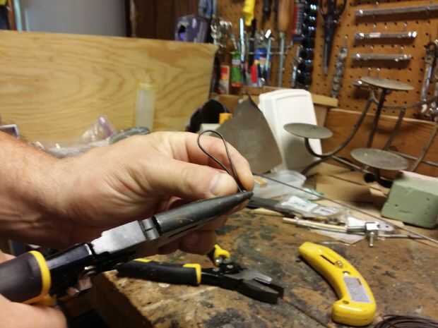 Después te retiras en medio usted necesita hacer algunas curvas. La forma final que buscas como un gancho básico se muestra en la última foto. Necesita una pierna vertical, un quiebro horizontal, pierna vertical y su gancho. La longitud de la primera pierna vertical y la horizontal jog son lo juega la mayor parte de su gancho está más firmemente en el tablero de clavija. También, si el primer tramo vertical es algo ubicado ayudará a estabilizar el gancho.