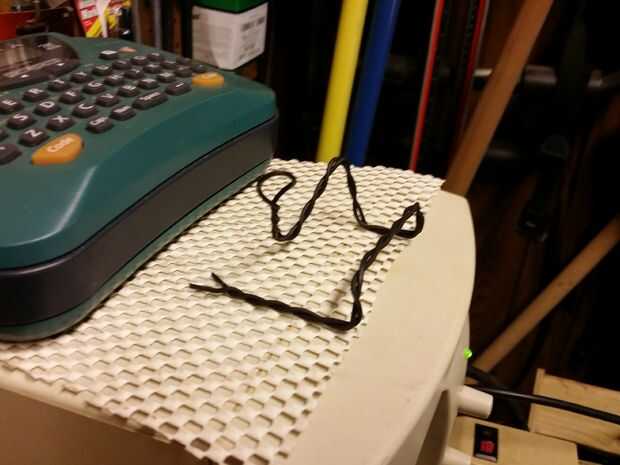 En la muy ocupada, casi imposible de discernir claramente cualquier imagen son pedazos de alambre del lazo utilizado para sujetar pinzas de freno al cambiar pastillas de freno.