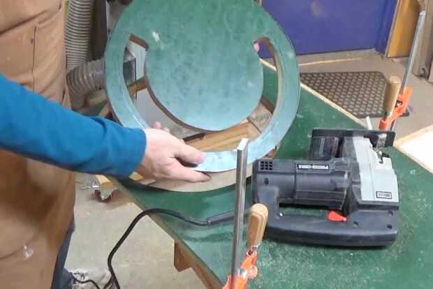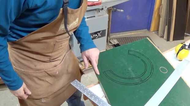 También tengo algunos contrachapado de desecho recuperado. Esto solía ser un tablero del escritorio del aula por lo que es madera contrachapada gruesa recubierta de un 1/8" espesor superior recubrimiento plástico. He trazado la circunferencia de la canastilla superior, medido y marcado para el recorte.