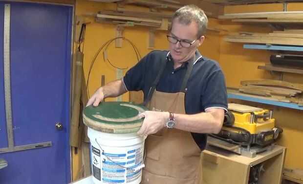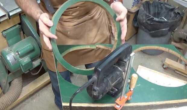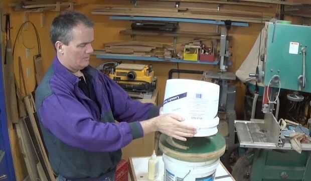 No tengo tapas para estos cubos, y el disco deflector debe también servir como tapa para el cubo más grande. Aquí trazado el buck y corte un anillo ancho de 1" más que chatarra de madera contrachapada.