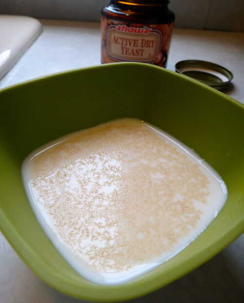 En un cristal o plástico arco, l pone la leche, el azúcar y la levadura seca. Cubra con una toalla o plástico de envolver y ponerlo en un lugar cálido para una buena 10 minutos. Usar la función de