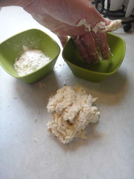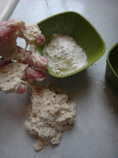 Poner un poco de harina a un mostrador y las manos. Amasar un par de veces. ¿Todavía es demasiado pegajosa? Repita este paso de harina/amasar hasta que la masa deje de pegarse a los dedos y el tazón de fuente. La clave aquí es ir por la sensación y añadir la harina un poco en el tiempo. ¿Qué es un poco que pregunte? bueno, unos pellizcos, una cucharadita... todo lo que flota su barco.