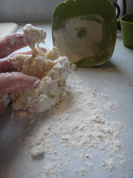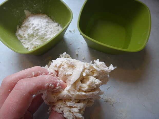 Tienen un pequeño recipiente con agua. Mojar la palma de las manos y amasar. Repetir este proceso hasta que el down no es tan gruesa y quebradiza. Masas diferentes requieren diferentes cantidades. ¿Utilizar los sentidos, hace sentir suave y elástica?