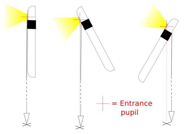 - Cuando tiro completamente hacia arriba o abajo (tiros de CENIT y nadir) puede tratar de compensar el desplazamiento de philopod colocando un poco en el punto de referencia en el piso. Cuando la línea está en el lado opuesto de la lente (que va hacia el cénit) puede tratar de cambiarlo para que la línea tenga más cerca al eje de la pupila de entrada