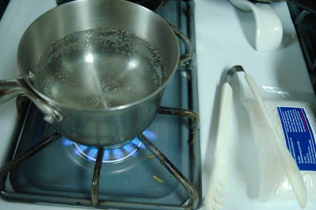 Para trabajar con el plástico, yo primero agua caliente en la estufa casi a ebullición. Entonces apagué el calor y arrojados a un montón de pastillas en el agua, viendo en fascinación como llegaron a ser transparentes. Luego sacaron el agua con pinzas y empezó a trabajar con él.