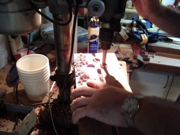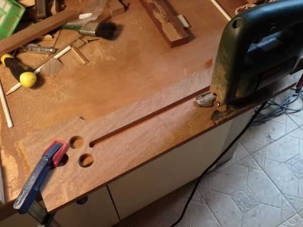 Usé la mesa de fresadora para hacer la ranura central. El taladro y una fostner broca para taladro de 3 agujeros en la parte superior. Por último, la sierra caladora para cortar los lados.