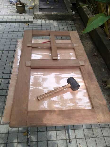 la puerta fue construida con mortaja y espiga carpintería. Otro detalle bastante típico que incorporado en la puerta es el vidrio coloreado con textura que se ve a menudo en antiguas puertas tradicionales en Malasia.