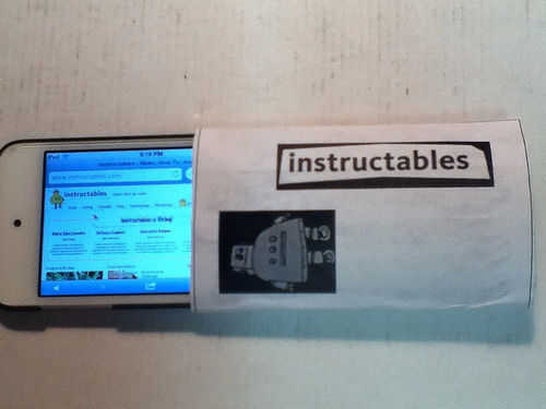 Obtener tubo de papel higiénico. Romper por la mitad. Inserte el ipod touch.