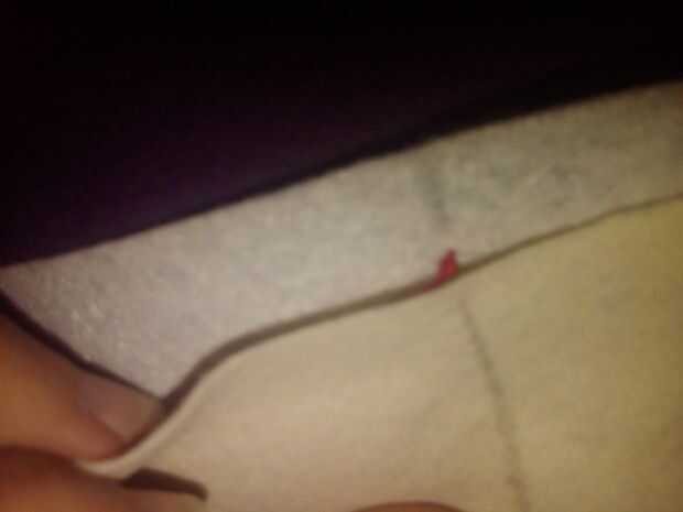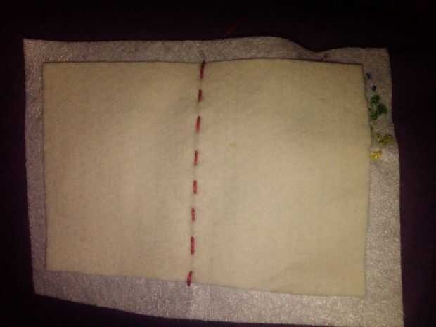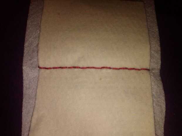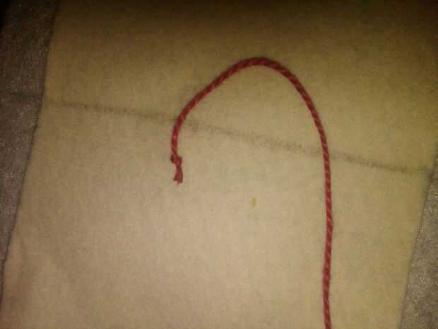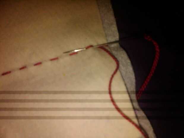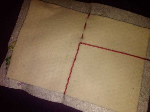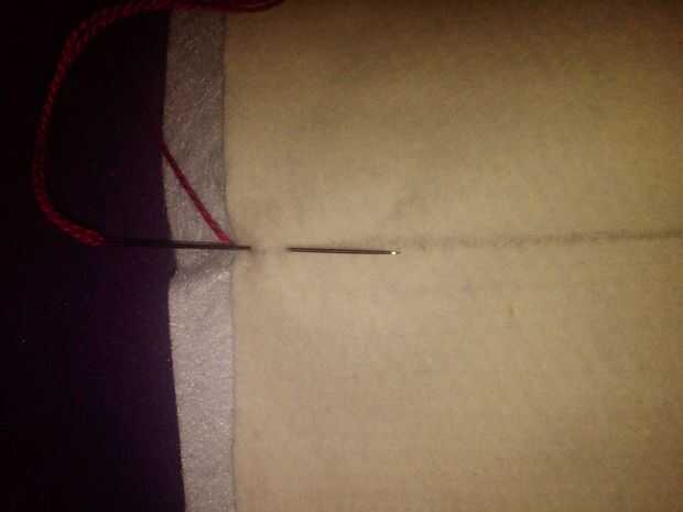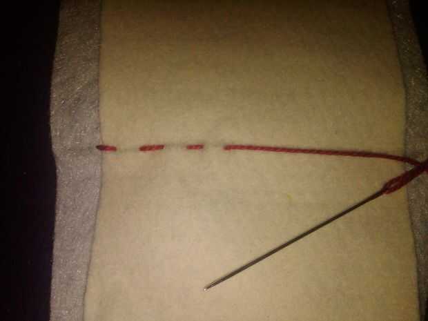 Un pequeño nudo en el extremo del hilo de rosca del bordado e introducir la aguja dentro de la pieza más grande, justo debajo de la línea que une el pedazo más pequeño en - esto debería ocultar el nudo por debajo de la pieza más pequeña cuando se completa el caso de aguja.