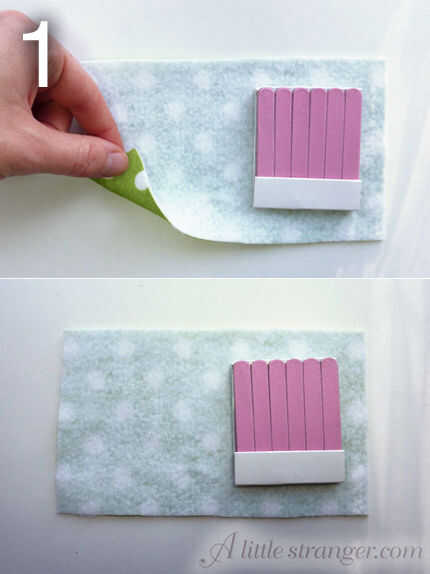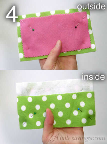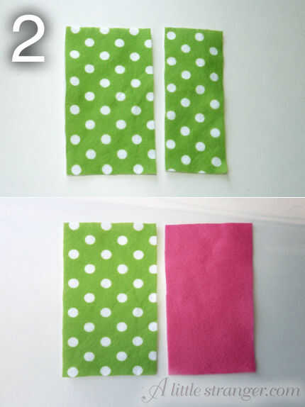 2) corte otra pieza verde fieltro la misma longitud que el cuerpo principal pero 2 cm más estrecho. Se trata del interior bolsillo. Cortar un trozo de fieltro rosado del mismo tamaño que su cuerpo principal.