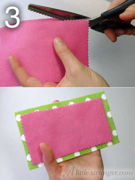 3) corte 1 cm del fieltro rosa, todo el camino alrededor, usando tijeras dentadas.