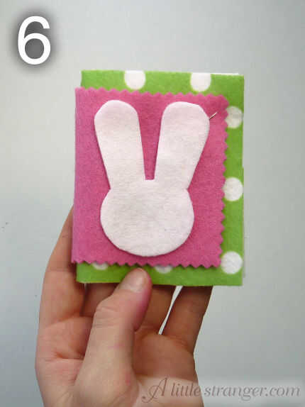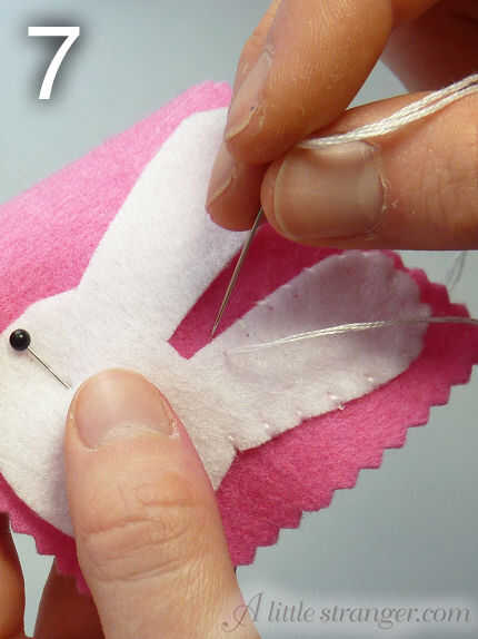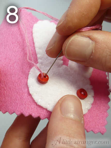 7) Desmontar el caso dejando solo el fieltro rosa. Coser todo el camino alrededor de la cara de conejo, lo cosa bien el fieltro rosa.