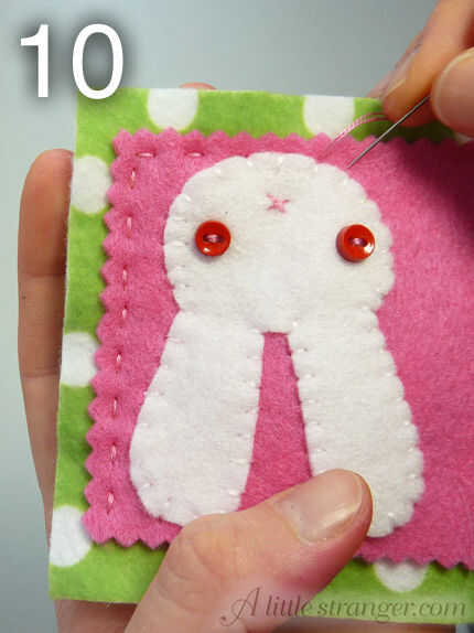 10) Utilice la puntada recta para coser a través de las tres capas, aproximadamente de 3 mm en el borde del fieltro rosa.