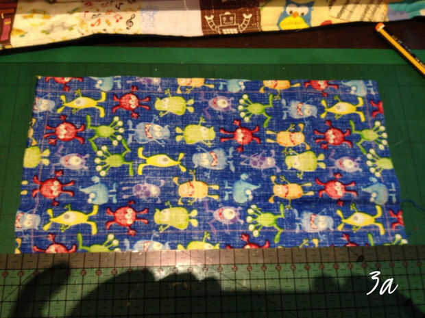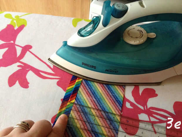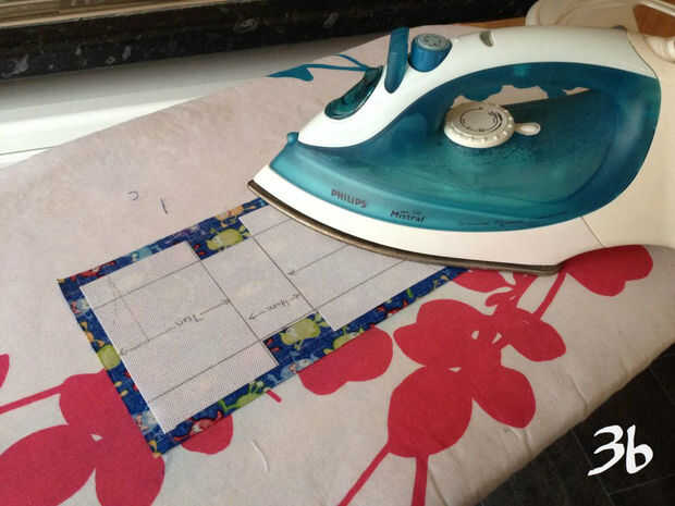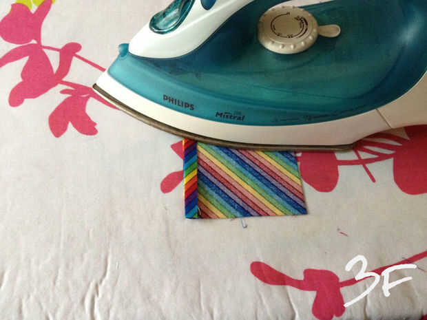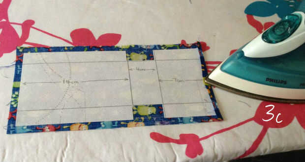 Tome el pedazo largo interior y doblar por la mitad con los lados derecho de tocar (3d). Una vez el doblez la tela debe medir 13,5 cm x 10 cm. doblar hierro en su lugar. Pliegue sobre la parte superior los bordes del revés por el revés 1cm y hierro en su lugar (3e y 3f).
