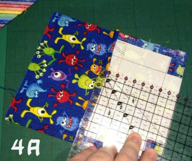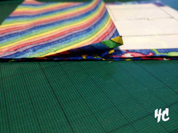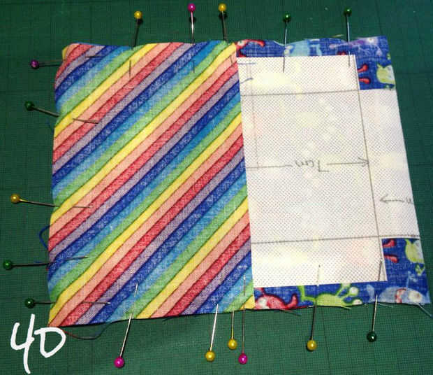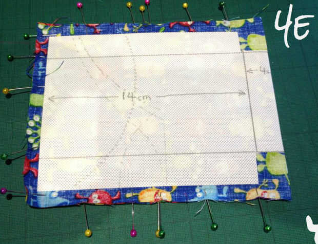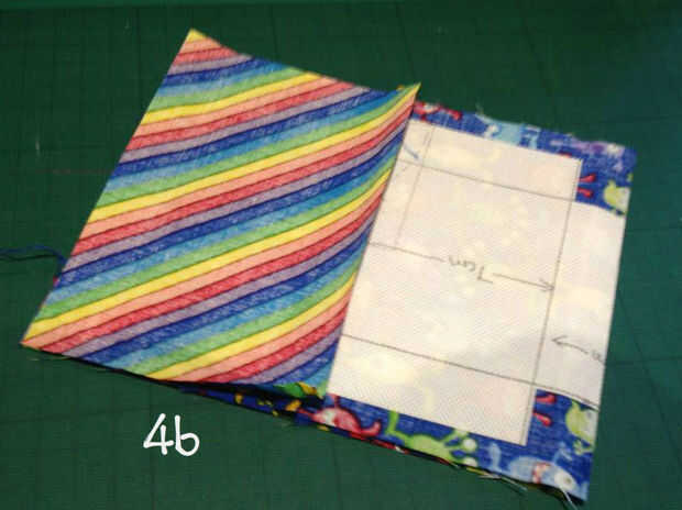 Tomar la pieza exterior. Doble a la tela 9cm desde el borde plegado corto, derecho lados juntos (4a).