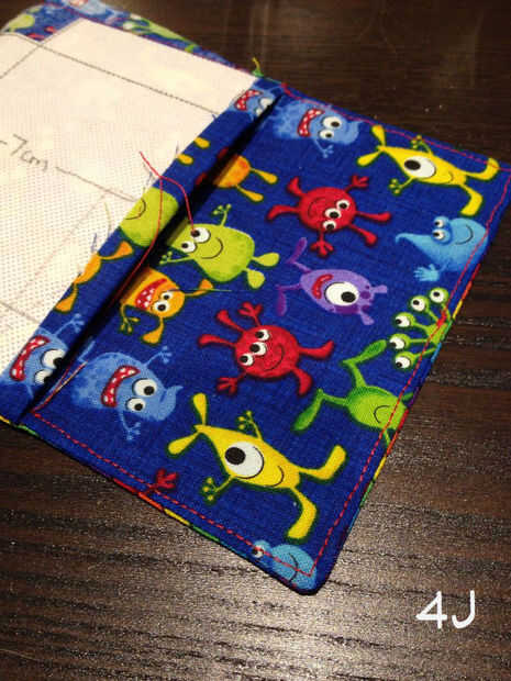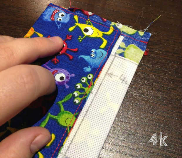 Alrededor de la solapa recortar los márgenes a unos 0,5 cm y sujete las esquinas (4h). Gire que la aleta derecha hacia fuera, prensa y parte superior coser el borde si lo desea (4i & 4j). En este punto usted puede también encontrar útil para doblar en un pliegue de su aleta (4k).