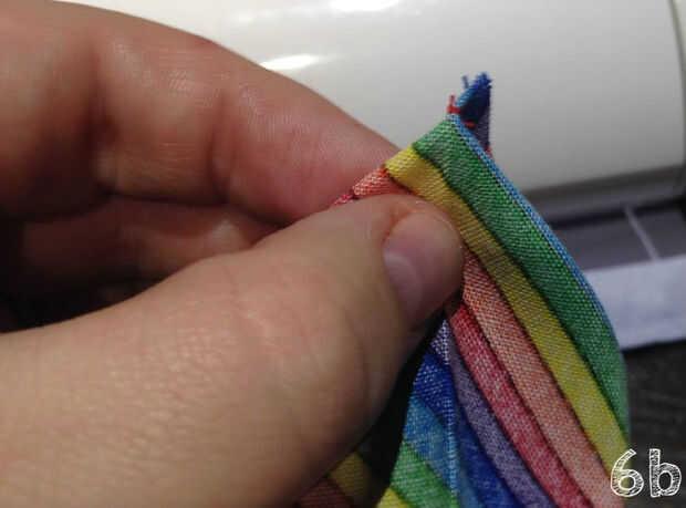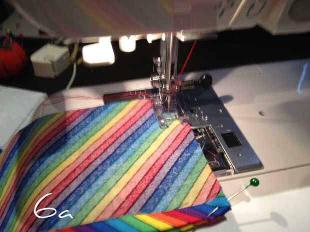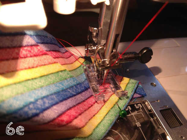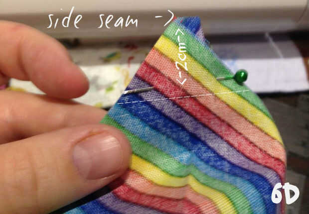 Una vez que su triángulo, medir 2cm abajo del pliegue de la parte inferior y hacer una línea. Costura recta en todo esto para hacer el fondo plano (6c). Este pequeño triángulo en lugar del PIN. La costura lateral y el pliegue inferior deben tocar cuando haces este (6d).