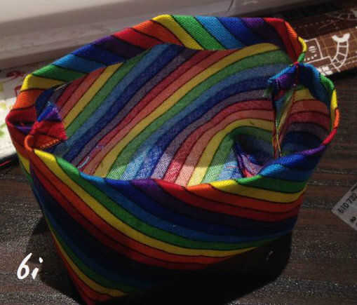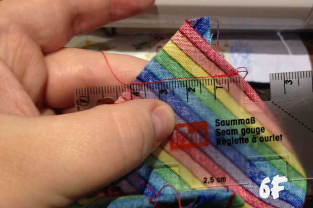 Coser a lo largo de la línea que marcaste (6e). Una vez que se ha hecho, la base del triángulo pequeño debe medir 4cm (6f). Si no, descoser y coser otra vez. Si lo hace, luego cortar los triángulos hasta un pequeño margen (6 g).