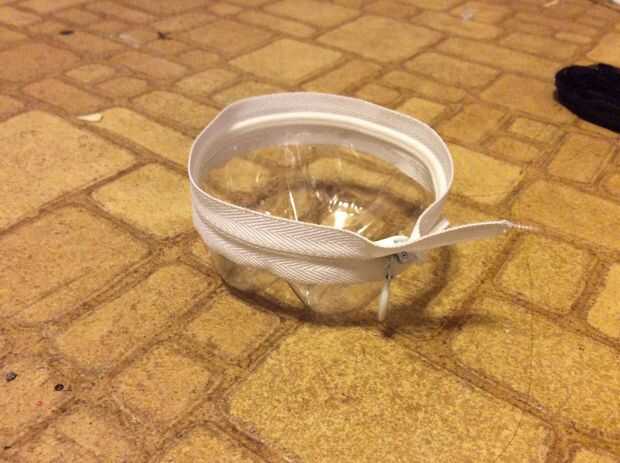 para esto puse un pequeño punto de pegamento caliente sobre la pieza de la botella y pegar la cremallera a este lugar, luego pegar la cremallera el resto de la manera alrededor de la botella puso el pegamento caliente en la cinta de la cremallera en secciones pequeñas y presiona a la botella. Este es el mejor método que he encontrado para pegar estas cosas.