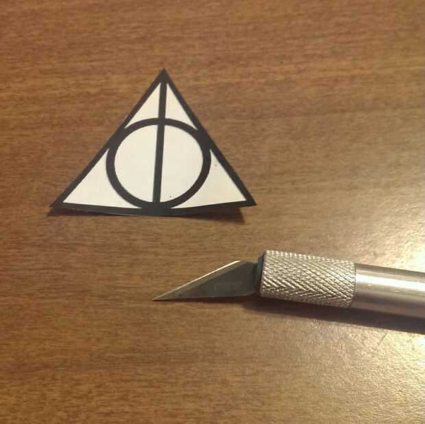 Emblema opcional: Si vas a usar un emblema como las reliquias de la muerte, colocar la cartulina con su emblema en su estera de lugar o de cartón. Use un cuchillo x-acto para cortar cuidadosamente los datos que desea ver a través de una vez que se pega encima el otro diseño. (Solo cortar el exterior del diseño de triángulo con las tijeras y luego cortar el interior blanco piezas indicadas con el cuchillo x-acto.)