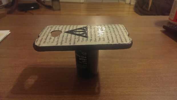 Si usted está utilizando pintura o brillo, debe intentar conseguir los cantos delanteros (en la segunda foto de arriba) como posible sin conseguir demasiado en el interior que se tocarán su teléfono. No preocuparse sobre ello en este caso, porque este caparazón va sobre una cáscara de silicona antes de que salga en el teléfono, por lo que ninguna pintura rugosa o mod podge tocará el teléfono si me Lio hasta el interior. Durante todas las fases secadoras, te recomiendo dejarlo secar en algo pequeño que está justo tocando el secado interior de la caja (ver dos fotos de arriba); Solo usé la botellita de brillo. * Repito, deje que se seque bien entre todas las capas de pintura o mod podge! Usted me agradecerá :)