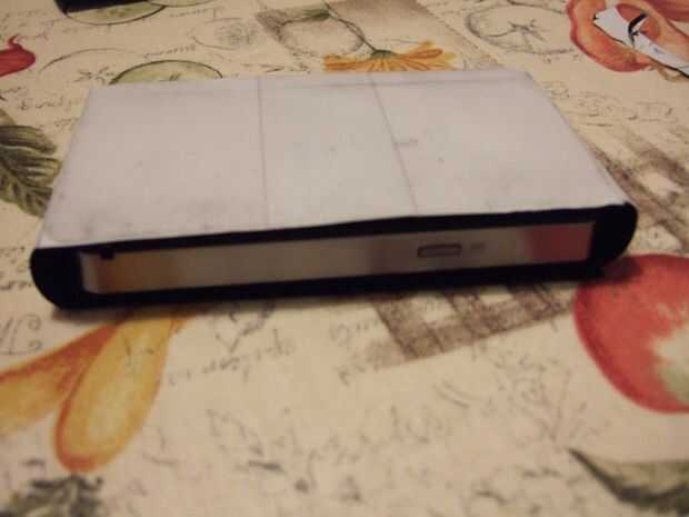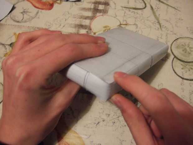 a continuación, coloque pedazos de cinta a los extremos de uno de los lados, con el lado pegajoso hacia al igual que el resto. Ahora voltear y envolver alrededor del aparato (Fig. 2). Manteniéndolos así, plegar el otro lado encima de ellos. Quieres tener los dos lados alineados entre sí, que tiene unos pocos intentos, así que no se peguen demasiado firmemente para comenzar con.