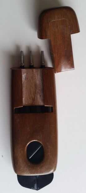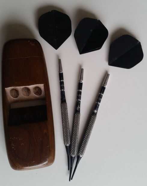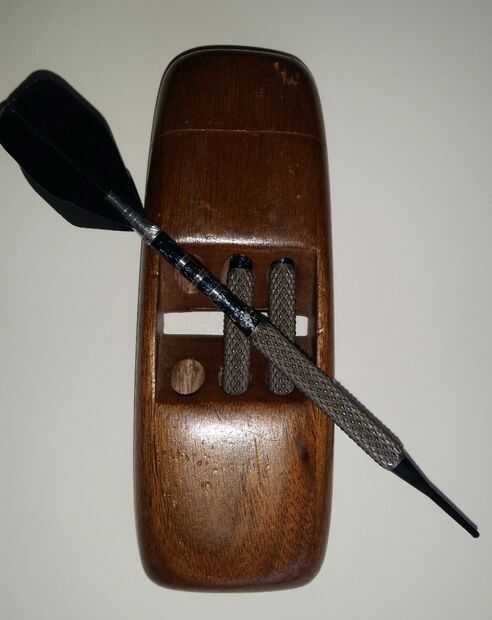 Esto hice aproximadamente hace 20 años, en su día, cuando solía frecuentar bares y de vez en cuando jugar a los dardos. Los casos de plástico tienda comprado eran grandes y algo voluminosos; Quería algo que podía tener cómodamente en el bolsillo. Después de unas cuantas cervezas tienden a ser olvidadizos y no quiero dejar mis dardos en algún lugar. Así después de todo ese tiempo la caja es un poco atontado para arriba, o se podría decir que tiene carácter adquirido. El caso tiene tres dardos hay una muesca del pulgar en la parte posterior para el deslizamiento de la tapa se unió a cola de Milano (véase cuadro 4) la fricción de vuelos (plumas plástico) encaja en una ranura en la parte inferior y se puede empujar fuera de la ranura por el agujero del pulgar en la parte posterior.