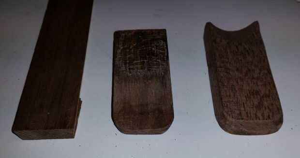 Esta es la pieza que se une a la tapa que se desliza en el caso de dardo, debe ser lo suficientemente apretada como para permanecer en el lugar pero suelta suficiente ti puede ser deslizado en una salida con sólo la fuerza del pulgar. Esto se hace por ensayo y error y mucha paciencia. empezar haciendo la anchura de la llave un poco más ancha que la ranura del receptor (paso anterior) y mordisquear lejos en él hasta que quede el ancho perfecto, usted puede doblar palo cinta adhesiva un pedazo de chatarra en la parte superior para darle algo más que aferrarse al trabajar la pieza para evitar que otras los dedos. En la segunda foto ver esta pieza en tres etapas, primero el corte áspero, el segundo que al final de esta pieza se redondea para caber en el receptor, otra vez hace por ensayo y error con un cuchillo o una lija hasta llegar el radis correcta. Por esta razón haces piezas extras, un poco demasiado el lado y empezar de nuevo. La tercera pieza en la segunda selección es con la muesca de pulgar empuje enarenada hacia fuera.