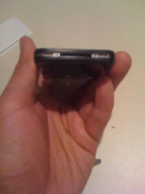 Orificio de 4,5 cm x 0,3 cm en algún lugar. Se trata de la abertura de altavoz de la parte inferior, micrófono y conector para ipod. La ubicación depende de donde usted quiere extremos de la costura hacia arriba. Decidí que la costura del lado de simslot así que corte esta ranura aproximadamente 6 cm de un extremo de la cinta.
