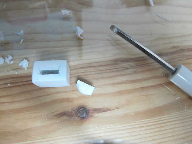 Poco a poco labrarse el contorno con el destornillador por lo que es lo suficientemente profundo para el USB que casi completamente cubre uno mismo pero no apretado en todos porque la mina se rompió dos veces así que tallar un poco más espacio.