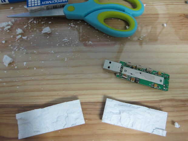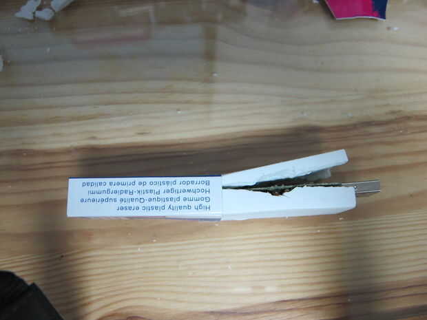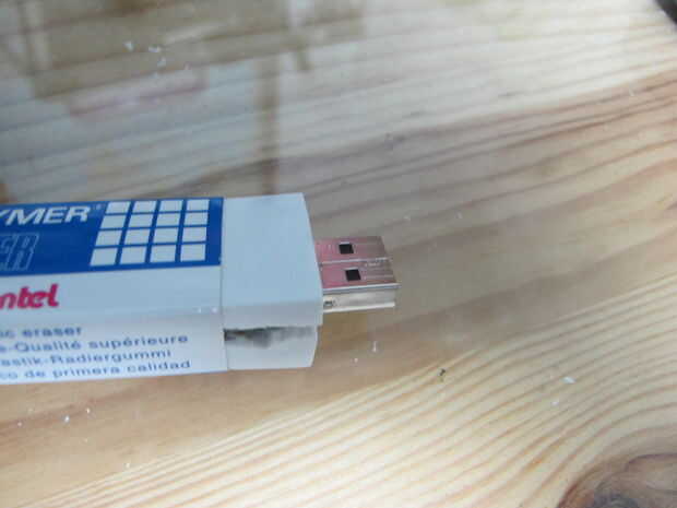 Entonces necesita tallarlo e intentar acoplar ambos lados con las tijeras para que el USB se puede caber con el borrador en el tablero de tarjeta. (el borrador de la vino con)