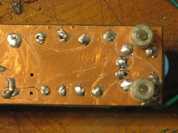 Usé un agradable, grueso tablero revestido de cobre. Para ello, dibujé el diseño sobre papel milimetrado, lo pegado a la PCB y perforado a través de la guía del papel. En el lado cobre de la Junta dibujaba las conexiones con un marcador y utiliza un cuchillo del exacto para cortar las brechas en el cobre. Había ampliado estas brechas con una lezna del rasguño, y hubo mis huellas (Fig. 6a).
