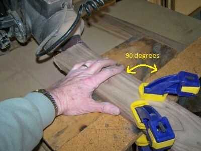 Las esquinas inferiores de la bandera del caso forma una esquina de 45 grados. Esto significa que las piezas formando estos rincones deben inglete a 22,5 grados. Cuando intenté configurar mi sierra para un corte de 22,5 grados, el protector de disco obstruido la pieza de trabajo por lo que no pude tirar el motor de la sierra a lo largo del brazo para hacer el corte. Sería posible establecer el corte con el protector de la hoja eliminado, pero que pondría mis manos en demasiado peligro. Marqué cuidadosamente el perfil de los cortes con un lápiz. Corte los ingletes con una sierra de mano dejando un montón de material extra. Luego recortado las piezas a la longitud y el ángulo correcto lijando el exceso con la configuración de tambor de lijado que se ve en esta foto.