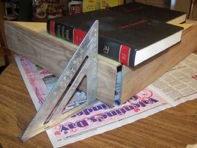 He visto un programa de carpintería sistema de radiodifusión pública en que el propietario construyó un caso de bandera.  También he visto planes en línea para un caso de bandera.  Los que están vinculados en el paso 2.  Ambos hicieron cosas diferentemente que decidí hacerlas.  Elegí pegar los pedazos de dos nuez más cortos en la parte posterior de la madera contrachapada.  Hace la parte posterior del caso de un miembro estructural de la Asamblea final.  Comenzar pegando uno de los pedazos más cortos como se muestra en la foto.