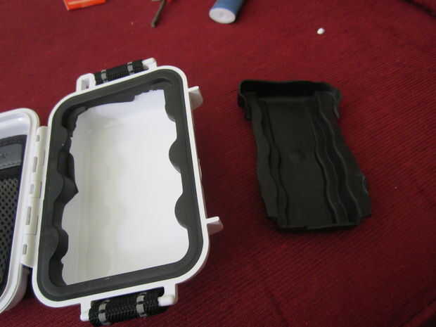 Este caso tenía un inserto de goma pequeño que fue utilizado para mantener fijo el iPod, pero ya no lo necesito solo iba a tirarla. Decidí guardar sin embargo, con el borde como una guarnición para asegurar que sellaría para arriba alrededor de los bordes de la caja cuando lo cerré. Cuando se corte, cuidadoso. Hace falta decir que cuando usas un cuchillo tienes que ser cuidadoso, pero puesto que este material realmente no mantiene su forma muy bien, cortarlo es más difícil. Es por eso que necesitas el cuchillo afilado. Casi quitó una buena parte de mi dedo cuando se deslizó sobre mí.