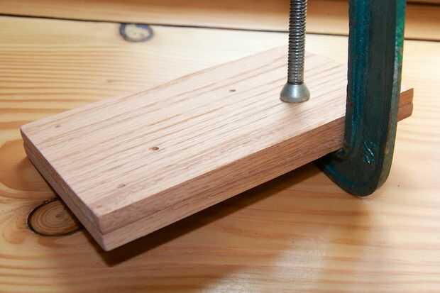 8) ahora Fije las dos piezas de roble junto a las marcas que usted acaba de hacer hacia fuera (Figura #4). Asegúrese de no sujetarlos juntos tan duro que marca la madera.