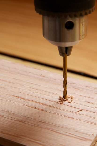 6) Coloque la tabla marcada en un pedazo de madera de desecho y taladre dos orificios en el tablero de roble donde hiciste las marcas del lápiz (Foto #2)